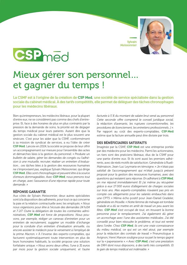 La CSMF, syndicat de services, a créé pour les médecins une société de services dédiée à la gestion RH des cabinets médicaux.